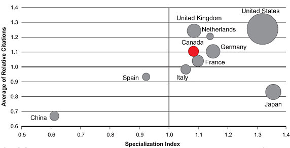 Figure 3 shows the average of relative citations (ARC) and specialization index (SI) for publications in IG mandate areas among the top 10 countries between 2000 and 2008. Canada scores above the world average (1.0) on both indices ranking fourth and sixth worldwide for ARC (1.10) and SI (1.08), respectively.