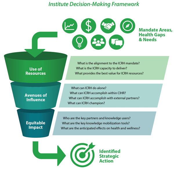 Collectively, the decision-making framework will support informed and intentional strategic choices for the Institute based on the best available information. In addition, the framework provides a common language that can applied to evaluate competing demands on ICRH resources. Finally, the decision-making framework is not time-limited and therefore can be applied on an ongoing, dynamic basis during the lifespan of The Plan.