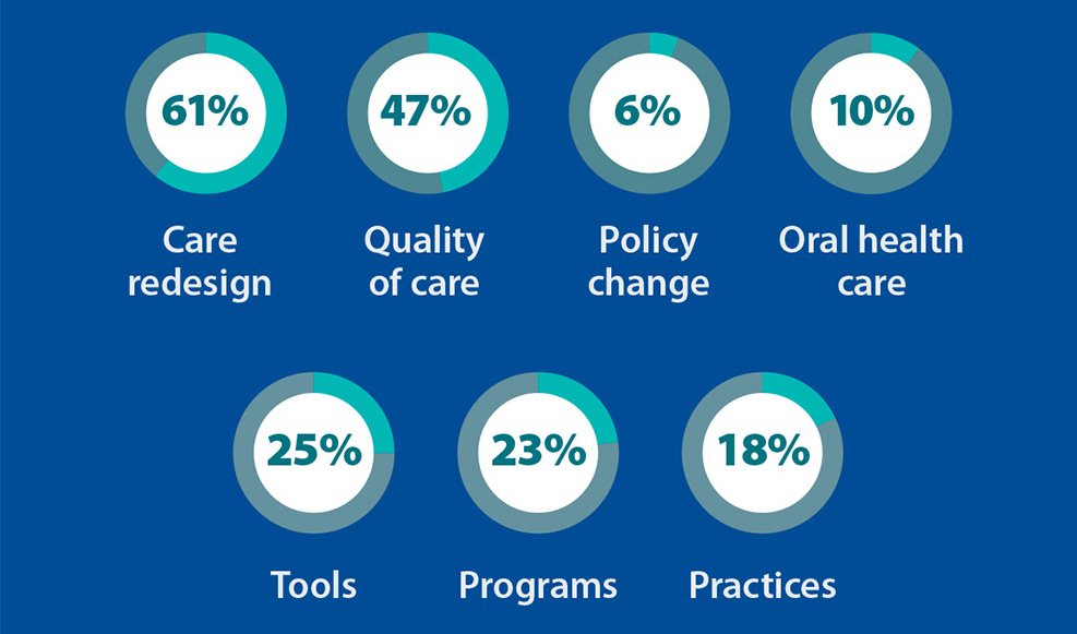 The most prioritized research target areas were care redesign (61%), quality of care (47%), policy change (6%), and oral health care (10%). A total of 44 cumulative interventions were developed in these target areas, most commonly: tools (25% of 44 interventions), programs (23%) or practices (18%); and were at various stages of development, i.e., implemented (39%), tested/piloted (20%) or spread or scaled-up (18%), suggesting a trend in the implementation science approaches.