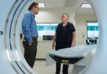 McCaig Institute Director Steven Boyd talks with a research participant about the MoJo's CT scanner. Photo by Don Molyneaux