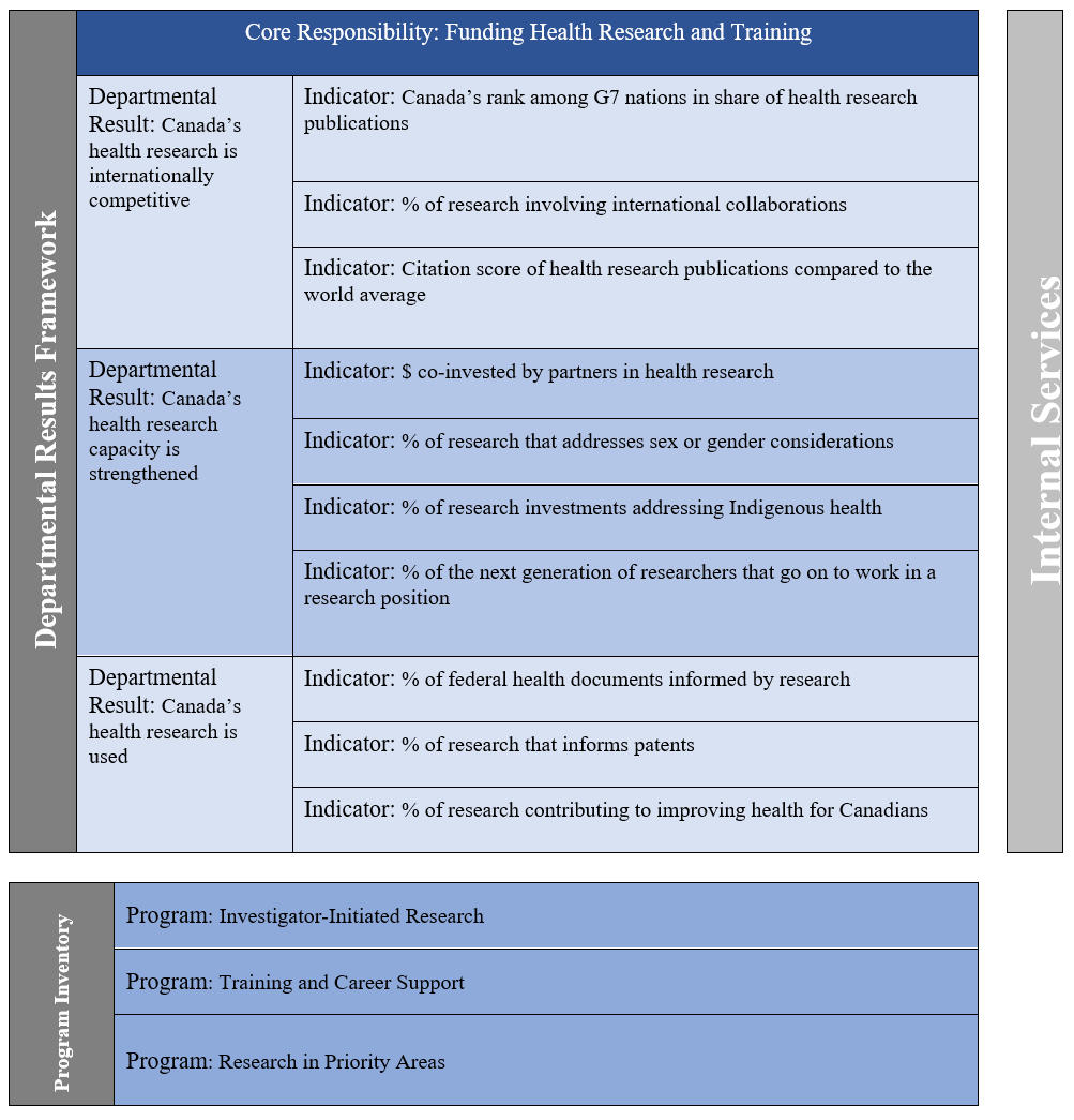 CIHR’s Departmental Results Framework and Program Inventory of record for 2020–21 are shown below.