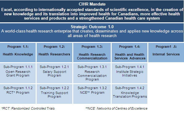 CIHR's Program Alignment Architecture (PAA), approved by Treasury Board in May 2009, is shown in the figure below. The PAA consists of one Strategic Outcome and five Programs that support the Strategic Outcome. The performance information presented in Section II is organized according to this PAA structure.