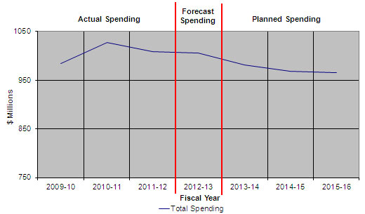 CIHR's actual spending increased from $983.8 million in 2009-10 to reach $1,026.9 million in 2010-11, and is forecasted to return to $1,006.1 million in 2012-13. In the absence of new funding, total planned spending will decrease annually in 2013-14, 2014-15 and 2015-16.