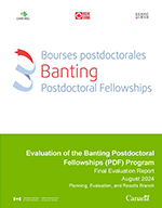 Special thanks to all participants in this evaluation through end of award reports, surveys, focus groups, and interviews, the Vanier-Banting PDF Secretariat, Goss Gilroy Inc., Observatoire des sciences et des technologies, SSHRC’s Corporate Analytics and NSERC’s Governance, Risk and Compliance units, CIHR’s Financial Planning Unit, and CIHR’s Funding Policy and Analytics Unit. Additional thanks to the members of the Banting PDF Evaluation Advisory Committee – Susan Morris (NSERC/SSHRC), Barbara Szijarto (NSERC/SSHRC), Murielle Vergnhes (NSERC), Anna Engman (SSHRC), François Zegers and Sean Daley (VBS), Judy Ettinger (Innovation, Science and Economic Development Canada – ISED).
