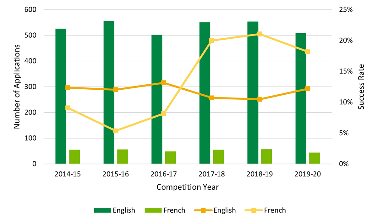 A separate analysis was conducted of all available funding data for Tri-agency grants and awards received by Banting PDF recipients and unfunded applicants of Banting PDF who had also received an agency-specific PDF from CIHR, NSERC, and SSHRC. As the first competition year for the Banting PDF was 2010, cohorts included Banting PDF and Tri-agency PDF recipients from the 2010-2020 period, and additional funding from competition years 2000 to 2020 was included in the funding history. This allowed the funding history data to capture any awards received by the first Banting PDF cohort (and comparable agency-specific PDF cohort) prior to their application, assuming that those at the fellowship level could have previously received a Master’s, Doctoral, and/or additional postdoctoral fellowship awards, as well as grants and awards achieved after their Banting PDF or agency-specific PDF, to the extent possible depending on how recently they received their fellowship. It is important to note that this funding history only included Tri-agency funding, and therefore could not capture an individual’s complete funding profile, nor would it capture funding received by individuals based outside Canada. Analysis of funding history data involved z-tests of proportions; t-tests of average funding amounts; and logistic and linear regressions with awards/grants received and award/grant value as outcome variables, Banting PDF application status (recipient vs. unfunded applicant) as predictors, and language and gender used as moderator variables in separate analyses. Analyses were conducted in SPSS (using the Hayes Process tool for moderation models). Alpha was set at 0.05 for statistical tests, although “marginal” significance close to the threshold of 0.05 was noted.