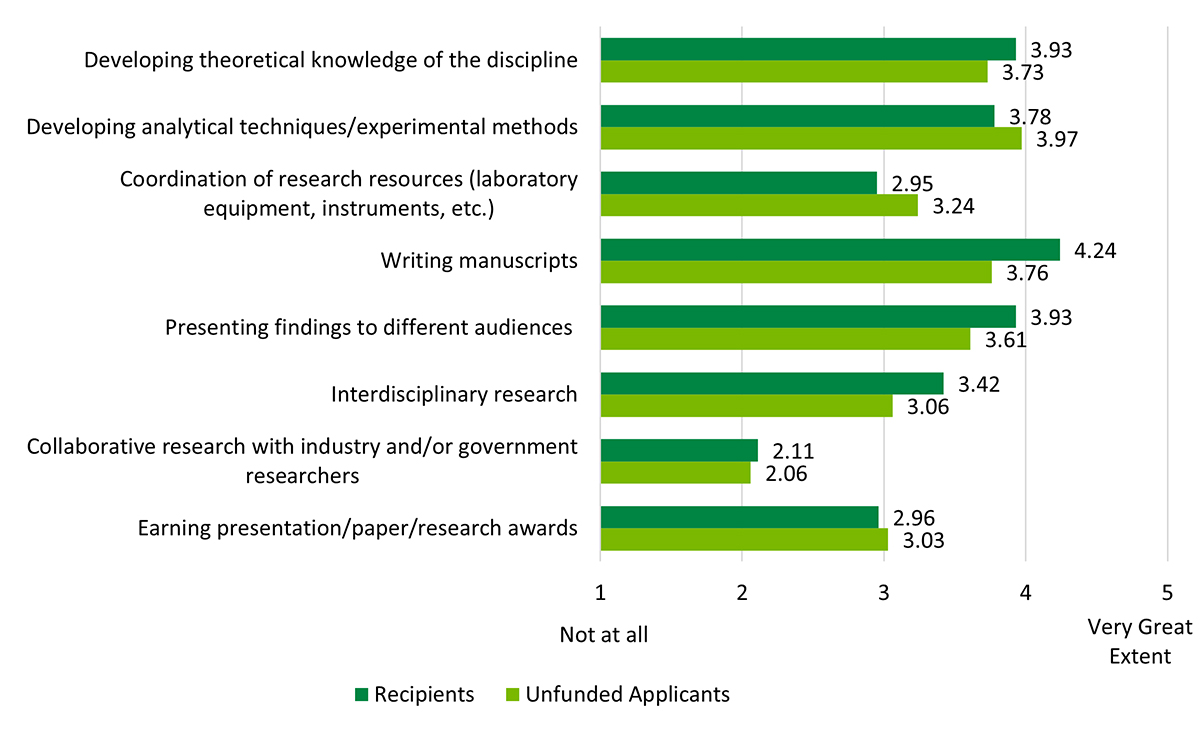 - Figure 3: Extent of improvement in research leadership activities for Banting PDF recipients (during the Banting PDF) and unfunded applicants (during their fellowship)