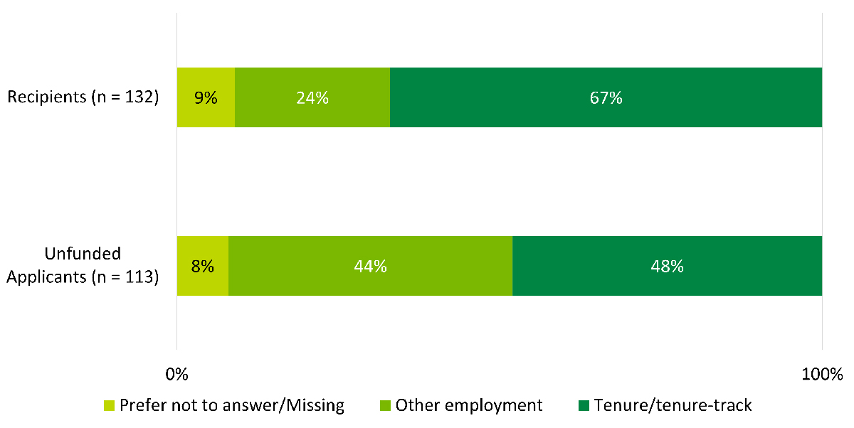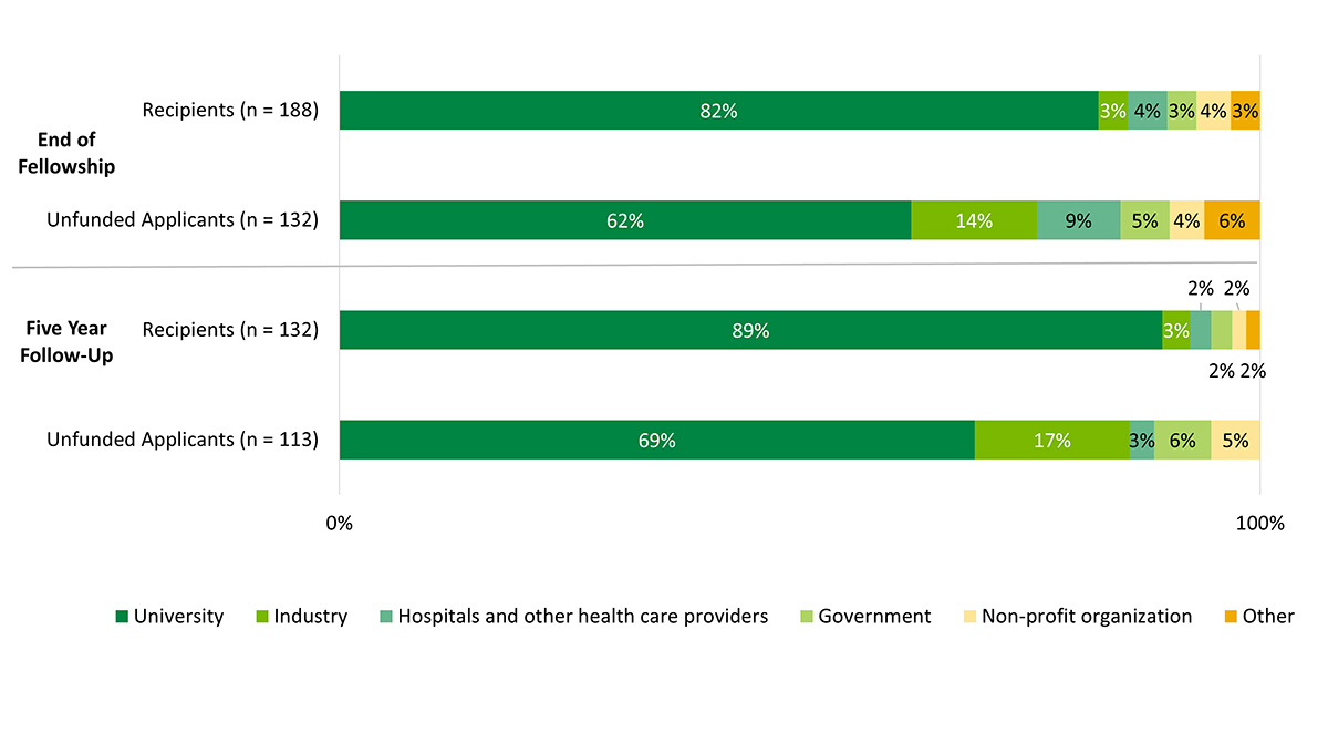 Note: proportions (recipient vs. unfunded applicant at end of fellowship and at five-year follow-up, and recipient at end of fellowship vs recipient vs five year follow-up) do not significantly differ (using z-test of proportions)