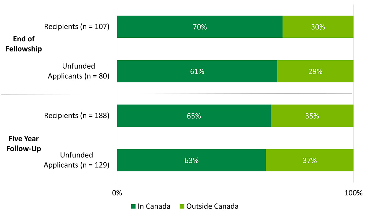 - Figure 8: Proportion of Banting PDF recipients and unfunded applicants employed within and outside Canada, at end of fellowship and five-year follow-up