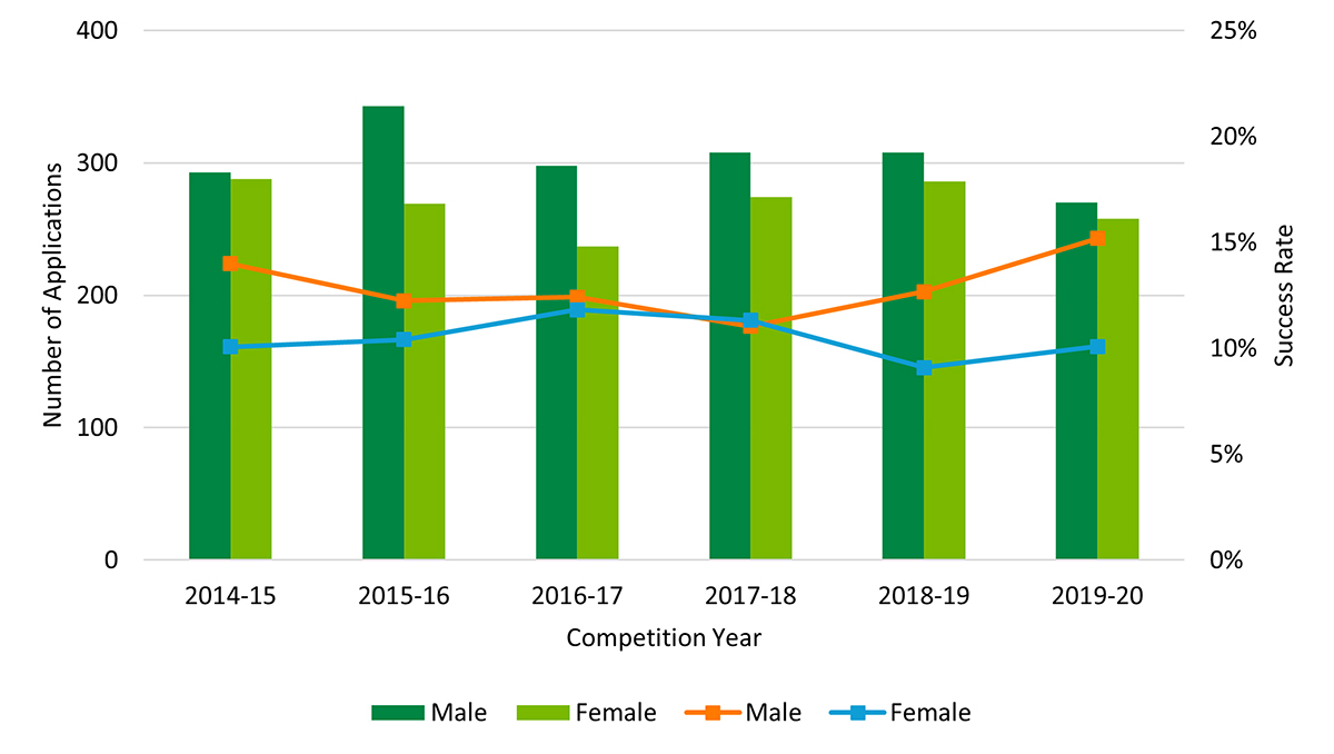 Figure 9: Number of Banting PDF applications and success rate by sex, 2014-15 to 2019-20