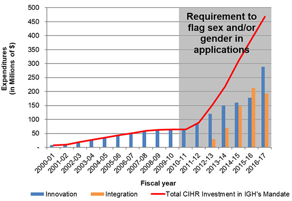 In line with IGH’s mandate, in 2010–11, CIHR introduced a mandatory requirement for all CIHR grant applicants to indicate how their research incorporates sex and/or gender considerations. These processes both encouraged investigators to bring considerations of sex and gender into their research as well as flag their applications as intending to incorporate sex and/or gender. Thus, the number of applications considering sex and gender has increased the number of grants classified under the IGH mandate, resulting in a significant increase in the amount of CIHR investment attributed to the IGH mandate (see Figure A in Appendix 3).
