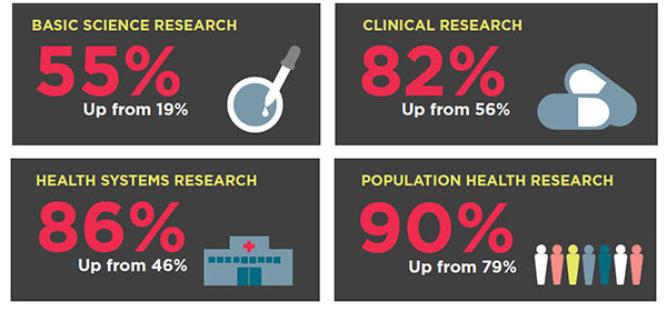 Another measure of capacity building is to track the number of researchers and trainees funded under IGH’s mandate. The number of researchers funded in IGH’s mandate is directly related to the amount of research investment mapped to IGH’s mandate. As a percentage of total CIHR funded researchers, researchers funded under IGH’s mandate steadily increased from 7% (n=291) in 2000–01 to 70% (n=7,848) in 2015–16, with an average of 55% from 2012–13 to 2015–16. The number of direct trainees funded under IGH’s mandate, as a percentage of the total CIHR-funded direct trainees, ranged from 2% (n=29) in 2000–01 to 42% (n=930) in 2015–16. The maximum (42%) was achieved in 2015–16. Both increases are a result of the CIHR policy requiring applicants to highlight sex and/or gender consideration in their applications; there is a need for monitoring compliance with claimed sex and gender considerations to improve the accuracy of statistics related to the IGH mandate.