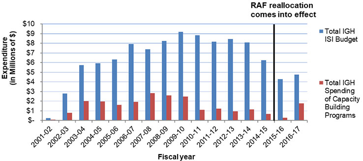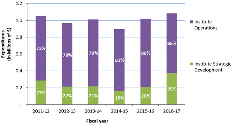IGH receives $1M annually from CIHR as an Institute Support Grant (ISG) to establish and sustain Institute operating costs and activities. Since 2011–12, IGH spent an annual average of 76% of its ISG budget on Institute Operations and 24% of its ISG budget on Institute Strategic Developments (ISD) (see Figure F in Appendix 3). Further analysis of the ISD reveals that spending on conferences, symposia and workshops accounted for 47% of ISD expenditures, expenditures for professional services averaged 25% and the operation of the Institute-specific IAB, while in operation, accounted for 19% of ISD expenditures. Since 2015–16, IGH has increased its expenditures in the ISD, which is partially attributable to supporting and facilitating Convener and Catalyst activities (e.g., consulting and convening communities, meetings to facilitate collaborations and partnerships) as well as advancing the Institute’s Integration strategy (e.g., SD and AD travel to present at conferences, the development of three interactive online training modules plus their associated annual hosting costs, and scientific meetings and travel costs).