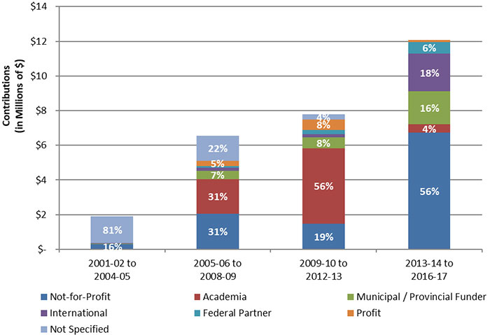 IGH’s convener and catalyst activities successfully leveraged funding to meet the needs of a large and diverse research community. Annual partner contributions to funding opportunities under the IGH mandate steadily increased from $377K to $40.1M from 2001–02 to 2016–17. Partner contributions to funding opportunities funded out of IGH’s budget increased from $37,861 to $3.7M in 2016–17, peaking at $4.1 million in 2015–16 (see Figure D in Appendix 3). When examining partner contributions to opportunities out of IGH’s budget between 2014–15 and 2016–17, the majority of partner contributions to IGH’s initiatives were from not-for-profit organizations and international organizations with an annual average contribution of $1.9M for the former and $727K for the latter.