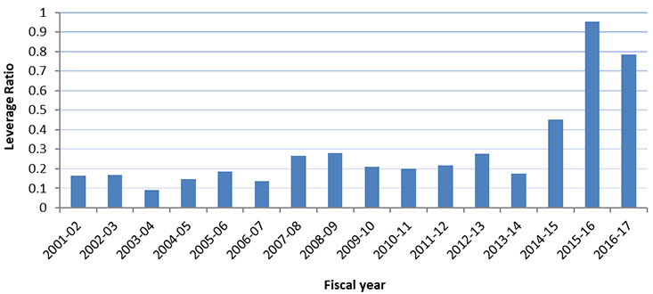 The average annual leverage ratio over IGH’s 16 year period is 0.29. This means for every $100 invested by IGH $29 was leveraged via external partners. After an increase from 0.17 in 2001–02 to 0.28 in 2008–09, the leverage ratio dropped from 2009–10 to 2010–11 followed by a steady increase from 0.27 in 2012–13 to 0.78 in 2016–17 (see Figure E in Appendix 3).Footnote 17