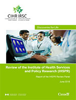 The review of the Institute of Health Services and Policy Research (IHSPR) was undertaken by the Canadian Institutes of Health Research (CIHR) as part of the review of the mandate and performance of CIHR Institutes by CIHR’s Governing Council (GC) outlined in the CIHR Act. The review assessed the relevance and performance of IHSPR to inform decisions regarding the role and functioning of the Institute. The review was conducted by the CIHR Evaluation Unit and overseen by a panel of experts in IHSPR’s mandate areas, the IHSPR Review Panel (hereafter referred to as the Panel), who reviewed and interpreted the findings and made the final recommendations. The observations and recommendations of the Panel are summarized below in relation to the two broad issues addressed by the review.