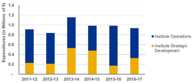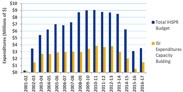 The Institution within which IHSPR operates receives $1 M annually from CIHR as an Institute Support Grant (ISG). Before 2011-12, IHSPR did not spend all of its ISG funding annually, the balance was transferred to the following fiscal year and therefore the total annual funds available for ISG exceed the $1M allotment to the Institute every year (see Appendix 3). Between 2011-12 and 2016-17, IHSPR spent an annual average of 67% on Institute Operations (which include staff salary) and the remainder was used for Institute Strategic Development (ISD). IHSPR uses the ISD portion of its budget to support convener and catalyst and capacity building activities such as Institute Advisory Board meetings, workshops and annual meetings.