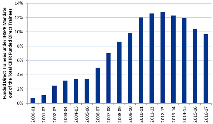 % of Funded Direct Trainees under IHSPR Mandate out of the Total CIHR Funded Direct Trainees 1% 1% 2% 3% 3% 3% 5% 7% 9% 10% 12% 13% 13% 12% 12% 10% 10%