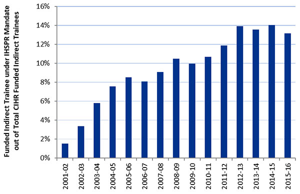 % of Funded Indirect Trainees under IHSPR Mandate of Total CIHR Funded Indirect Trainees 2% 3% 6% 8% 9% 8% 9% 10% 10% 11% 12% 14% 14% 14% 13%