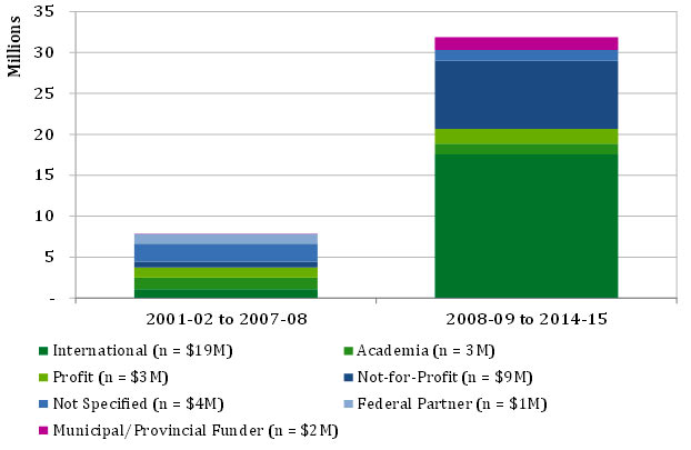 A key success of the Institute has been the creation and fostering of partnerships with researchers, knowledge users and funders. INMHA’s partnerships have resulted in an increased leveraging of funding from $7.9M for the period 2001-02 to 2007-08 to $31.9M for the 2008-09 to 2014-15 period. Notably, international partner contributions to INMHA funded research increased sharply from $1M to $17.5M (17-fold increase), not-for-profit partner contributions increased from 730K to $8.3M, and for-profit partner contributions increased from $1.2M to $1.8M over these two periods.
