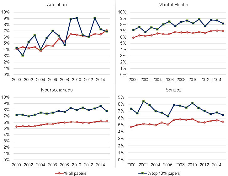 Source: Vincent Larivière, Benoit Macaluso. Observatoire des sciences et des technologies, Centre interuniversitaire de recherche sur la science et la technologie, Bibliometric Analysis of INMHA-Related Research, 2000-2015.