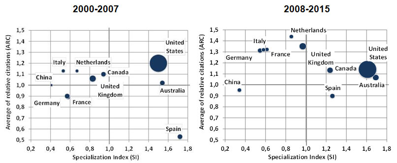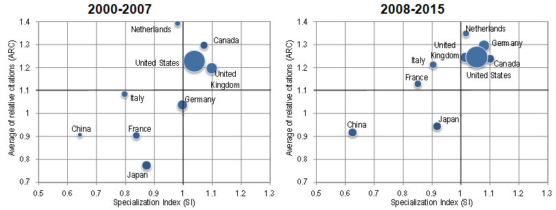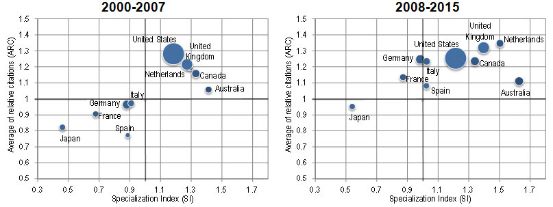 Figure 6: Canada in comparison to other Countries Specialized Index (SI) and Average Relative Citations (ARC)