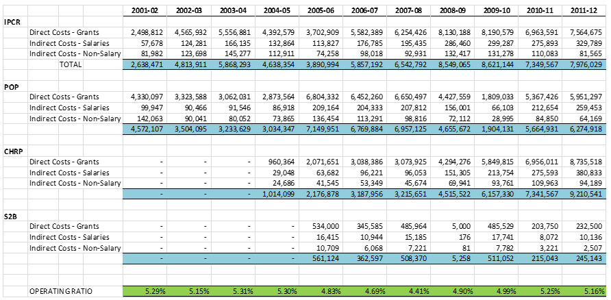 2001-02 2002-03 2003-04 2004-05 2005-06 2006-07 2007-08 2008-09 2009-10 2010-11 2011-12 IPCR Direct Costs - Grants 2,498,812 4,565,932 5,556,881 4,392,579 3,702,909 5,582,389 6,254,426 8,130,188 8,190,579 6,963,591 7,564,675 Indirect Costs - Salaries 57,678 124,281 166,135 132,864 113,827 176,785 195,435 286,460 299,287 275,893 329,789 Indirect Costs - Non-Salary 81,982 123,698 145,277 112,911 74,258 98,018 92,931 132,417 131,278 110,083 81,565 TOTAL 2,638,471 4,813,911 5,868,293 4,638,354 3,890,994 5,857,192 6,542,792 8,549,065 8,621,144 7,349,567 7,976,029 POP Direct Costs - Grants 4,330,097 3,323,588 3,062,031 2,873,564 6,804,332 6,452,260 6,650,497 4,427,559 1,809,033 5,367,426 5,951,297 Indirect Costs - Salaries 99,947 90,466 91,546 86,918 209,164 204,333 207,812 156,001 66,103 212,654 259,453 Indirect Costs - Non-Salary 142,063 90,041 80,052 73,865 136,454 113,291 98,816 72,112 28,995 84,850 64,169 4,572,107 3,504,095 3,233,629 3,034,347 7,149,951 6,769,884 6,957,125 4,655,672 1,904,131 5,664,931 6,274,918 CHRP Direct Costs - Grants - - - 960,364 2,071,651 3,038,386 3,073,925 4,294,276 5,849,815 6,956,011 8,735,518 Indirect Costs - Salaries - - - 29,048 63,682 96,221 96,053 151,305 213,754 275,593 380,833 Indirect Costs - Non-Salary - - - 24,686 41,545 53,349 45,674 69,941 93,761 109,963 94,189 - - - 1,014,099 2,176,878 3,187,956 3,215,651 4,515,522 6,157,330 7,341,567 9,210,541 Science to Business Direct Costs - Grants - - - - 534,000 345,585 485,964 5,000 485,529 203,750 232,500 Indirect Costs - Salaries - - - - 16,415 10,944 15,185 176 17,741 8,072 10,136 Indirect Costs - Non-Salary - - - - 10,709 6,068 7,221 81 7,782 3,221 2,507 - - - - 561,124 362,597 508,370 5,258 511,052 215,043 245,143 OPERATING RATIO 5.29% 5.15% 5.31% 5.30% 4.83% 4.69% 4.41% 4.90% 4.99% 5.25% 5.16%