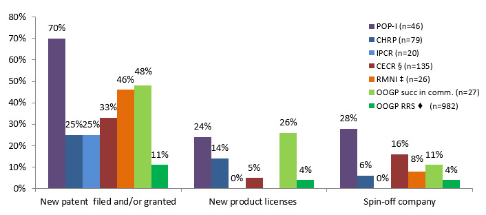 - Researchers funded under POP I reported higher percentages for commercialization outcomes compared to the other programs. OOGP researchers successful in commercialization, CECR and RMNI researchers reported higher commercialization outcomes compared to the IPCR and CHRP programs.