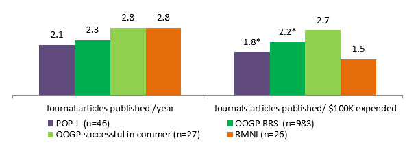 - In terms of knowledge creation, the majority of funded researchers (79%) published at least one journal article per grant, with 45% of the IPCR researchers and 30% of the POPI researchers producing a joint publication with the private sector. Despite the challenges that researchers face in terms of the pressure to publish and limited support for translational research, the tensions between commercialization and open science are not irreconcilable and could be envisioned as complementary elements of a more holistic innovation framework (Caulfield, 2012). For example, the scientific productivity (i.e., journal articles published) of POP I researchers normalized by grant duration and grant amount is similar to OOGP researchers, although knowledge generation is not a main objective of POP I.