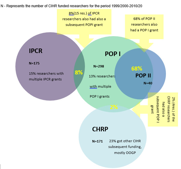 Administrative data analysis included analysis of the CIHR EIS (Electronic Information System) data, POP progress reports data and RRS data. In particular, the EIS data analysis covered areas such as program application pressure, characteristics of the funded researchers, program's financial commitments, researchers' CIHR funding trajectory, information about partnership agreements, etc. POP progress reports data analysis address indicators related to researchers' scientific productivity. RRS data was used for comparison with OOGP program.