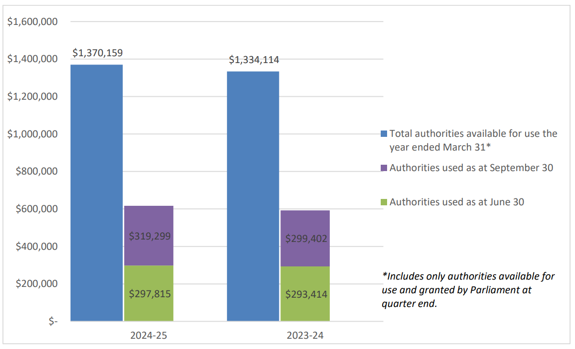 Authorities available for the period ended September 30, 2024 increased by $33.1 million (2.6%) over the prior year due primarily to additional health research funding discussed in Section 2.1. Authorities used through the quarter ended September 30, 2024 increased by $25.6 million (4.1%) compared to the prior fiscal year. The percentage of grant authorities used in the second quarter of 2024-25 (23.5%) is comparable to the authorities used in the second quarter of 2023-24 (22.3%).