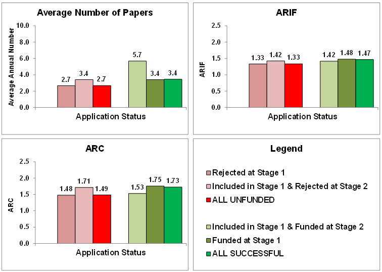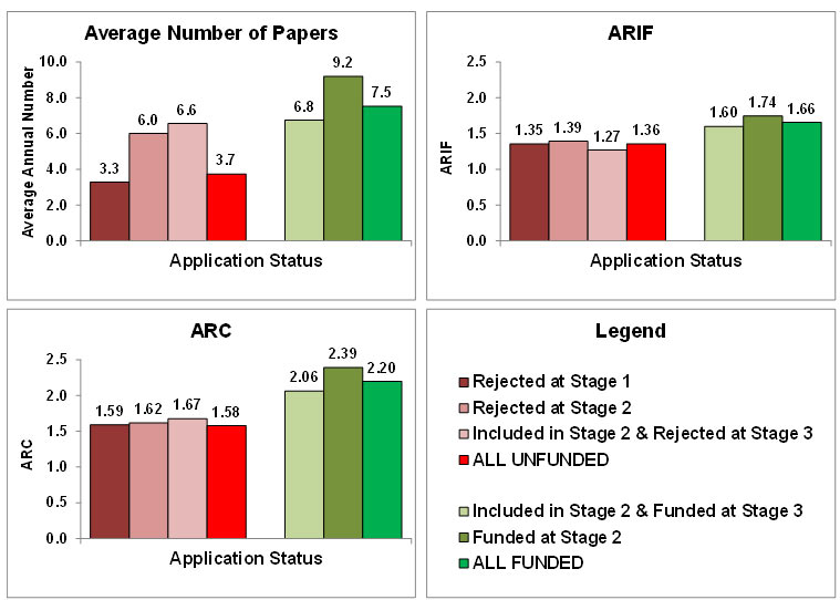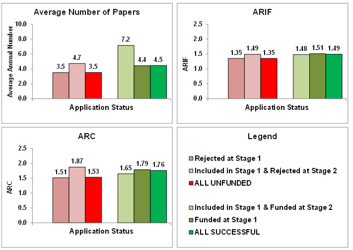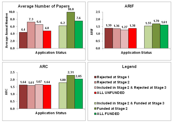 • The impact indicators (ARIF and ARC) of the publications from all categories of funded applicants are clearly higher than those of all categories of unfunded ones.