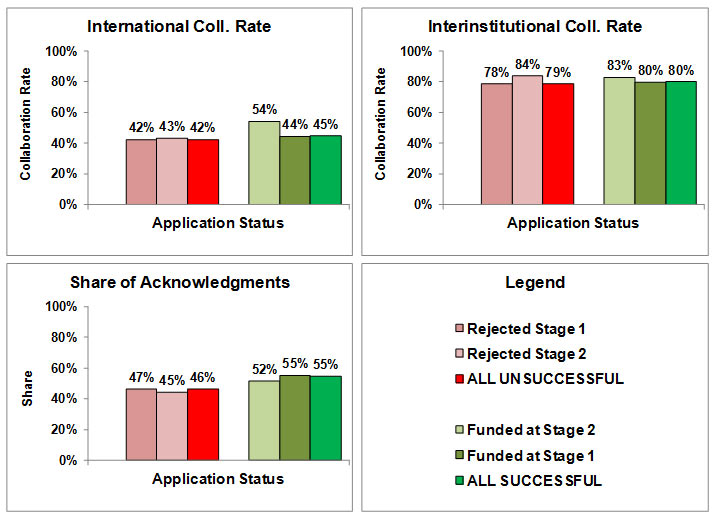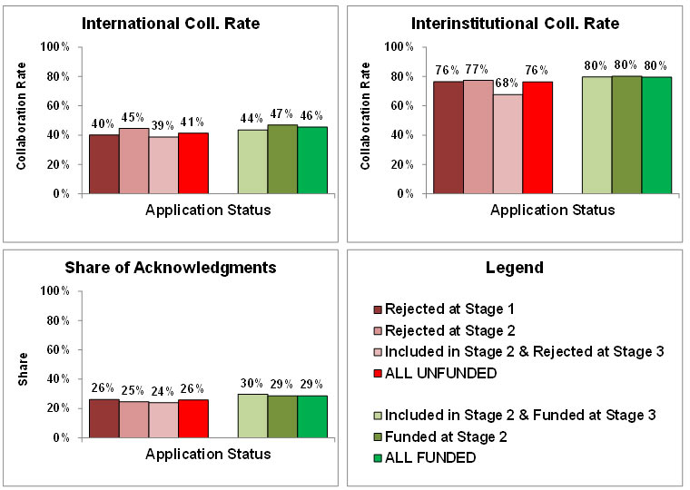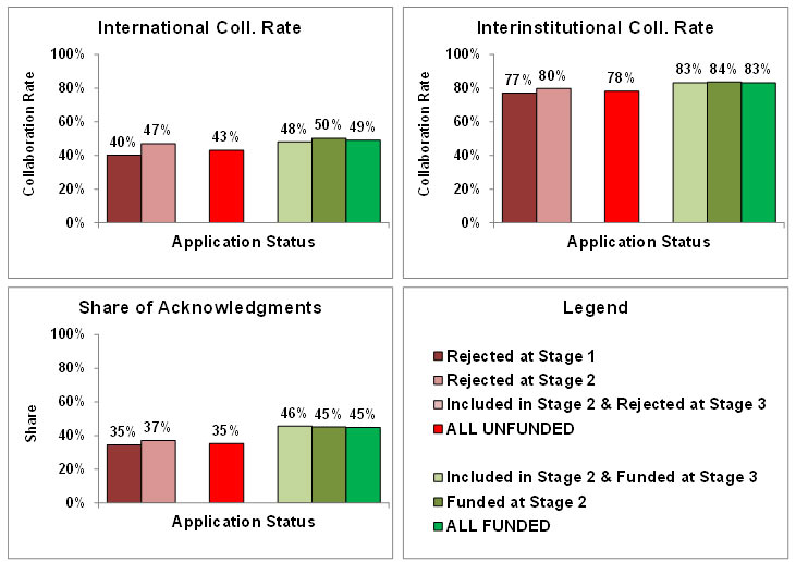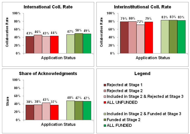 • The international and interinstitutional collaboration rates of all categories of funded applicants are slightly higher than that of all the categories of unfunded ones.