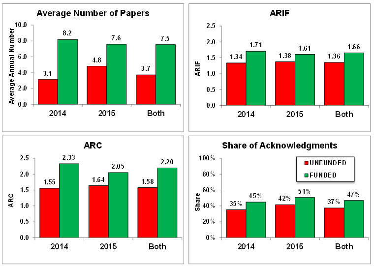 • Along the same lines, impact indicators show that funded applicants published in more visible journals (ARIF = 1.47) than their unfunded colleagues (1.33) and that their papers are also more cited (ARC = 1.73 vs 1.49).