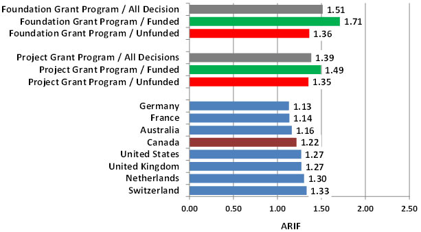 Figure 3-6 Average of Relative Impact Factors (ARIF) of Health Research Papers from Foundation and Project Grant Programs Applicants and from OECD Countries, 2008-2015