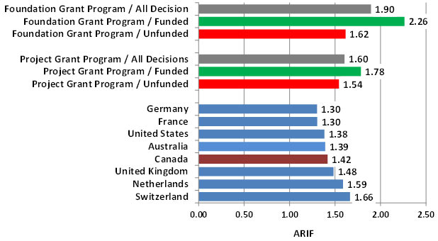 Finally, the benchmark indicators presented in sub-section 3.3 show that in the field of health research, the Foundation and Project Grant Programs are attracting high caliber researchers since applicants to both Programs, irrespective of funding status, have a higher scientific impact than all researchers from Canada and, in most cases, from other OECD countries.