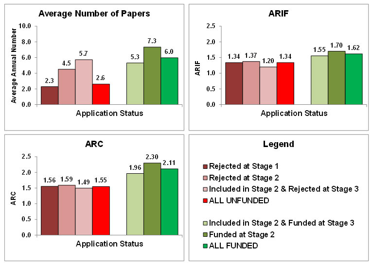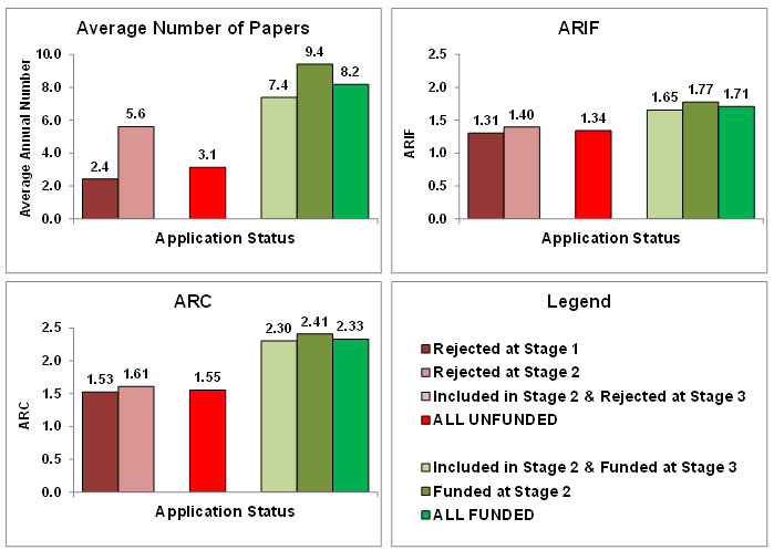 • Overall, funded applicants are also more productive than unfunded applicants. However, one exception should be noted: applicants rejected at Stage 3 appear to have published slightly more papers (5.7) than their peers who were funded at the same stage (5.3).