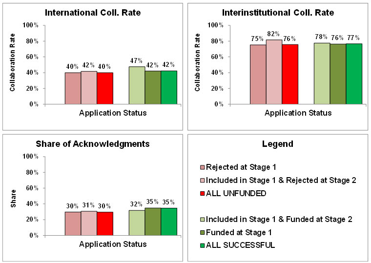 • At the interinstitutional level, all groups show a collaboration rate ranging from 75% to 78%, except for the group of applicants rejected at Stage 2; with a slightly higher rate of 82%.