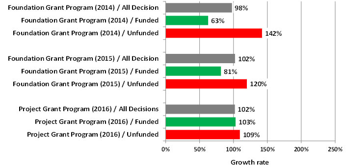 One should note that the differences in the growth rates between the groups reflect pretty well the differences between their average years of experience. While the applicants funded by the Foundation Grant Program in 2014 had 18.4 years of experience, their unfunded colleagues had only 10.8 years of experience. Similarly, for the 2015 competition, the funded applicants had 17.8 years of experience against 14.2 for the unfunded. In the Project Grant Program, the funded researchers had 15.5 years of experience as against 14.3 years for the unfunded ones.