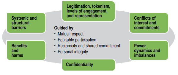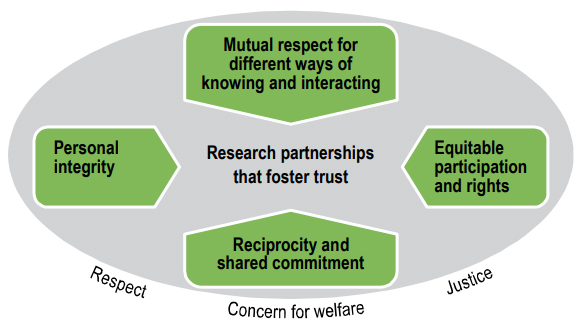 Reflections on these concerns should be guided by the four overarching considerations described in the previous section: mutual respect for different Ways of Knowing and interacting; equitable participation and rights; reciprocity and shared commitment; and personal integrity.