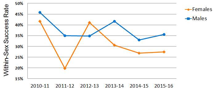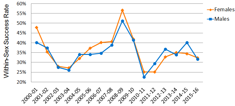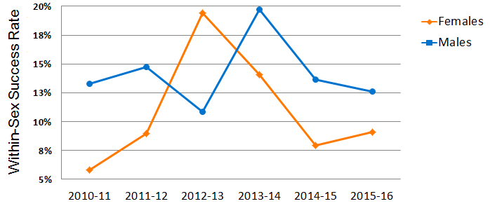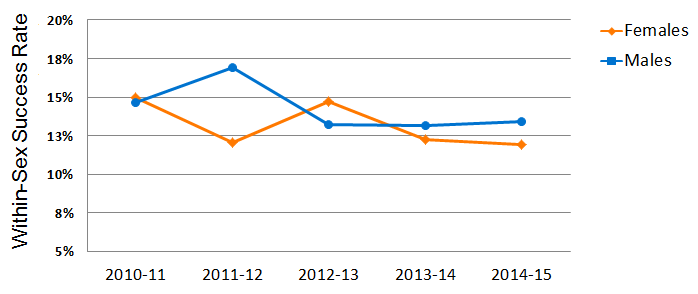 Methods: The data in this section represents the competition results of CIHR’s and tri-agency’s award programs from 2000/01 to 2015/16. Please note that, unless specified, the data is presented as within-sex success rates to take into account the proportions of applications received from males and females.