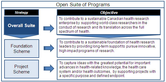 The objective of the new Open Suite of Programs is to accommodate a diverse mix of applicants at any career stage from across the spectrum of health research and knowledge translation (Figure 1).