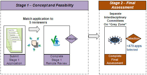In the February 2012 Design Discussion Document,a three-stage competition and application-focused review process was proposed for the Project Scheme. Members of the research community have raised concerns that it would be difficult to evaluate the quality of an idea/concept without also assessing the feasibility. As a result of this feedback, the remote review stages (Stage 1 and 2) were merged into a single stage for the Project Scheme. The two-stage Project Scheme competition and review process is illustrated below (Figure 2).