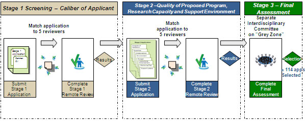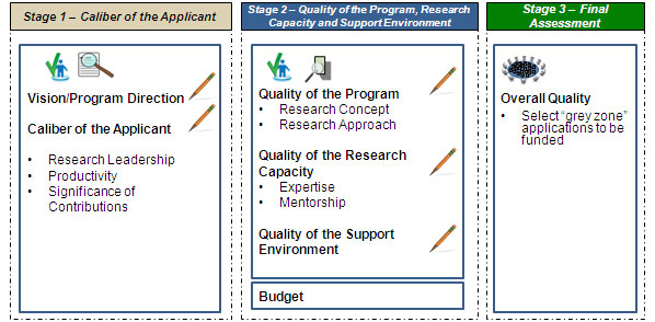 The Foundation Scheme is designed to contribute to a sustainable foundation of health research leaders by providing long-term support for pursuit of innovative, high-impact programs of research. There will be one Foundation competition per year. The Foundation Scheme will have a three-stage review process. The first two stages will involve remote review by five reviewers. The assessment criteria at Stage 1 will focus on the caliber of an applicant. Stage 2 will integrate elements of the caliber of the applicant, while focusing on the quality of the proposed program of research. As in the Project Scheme, the final stage of the review will involve a face-to-face meeting. Again, the objective of the final stage is to integrate the results of the independent expert reviews, and to discuss "grey zone" applications, with particular emphasis on applications with large variances in independent reviewer rankings.