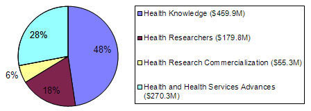 As evidenced above, CIHR spent 94% of its available resources directly to funding health research CIHR's primary goals are to fund the improvement of health and the health system through the creation of new knowledge across all areas of health research, to build health research capacity by supporting the training and careers of excellent health researchers, to support and facilitate the commercialization of health research, and to support the creation of new knowledge in strategic priority areas and its translation into improved health and a strengthened health system.